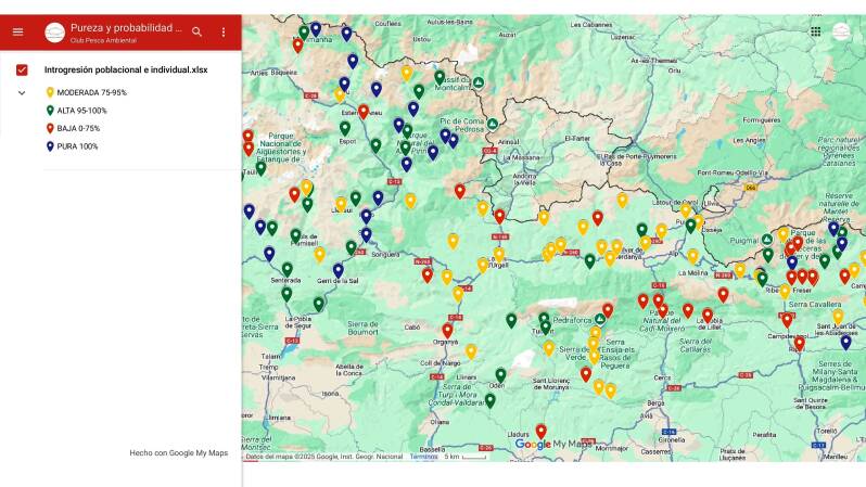 Mapa de la pureza genética de las poblaciones de trucha y probabilidad individual de pureza por cada ejemplar en los Pirineos catalanes.